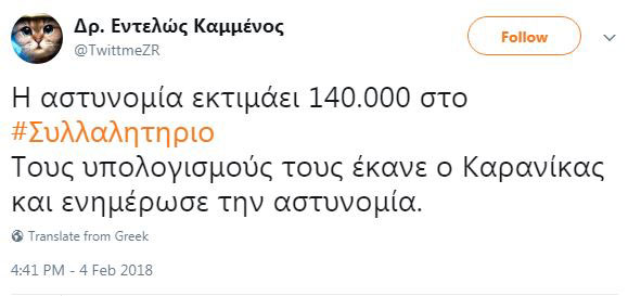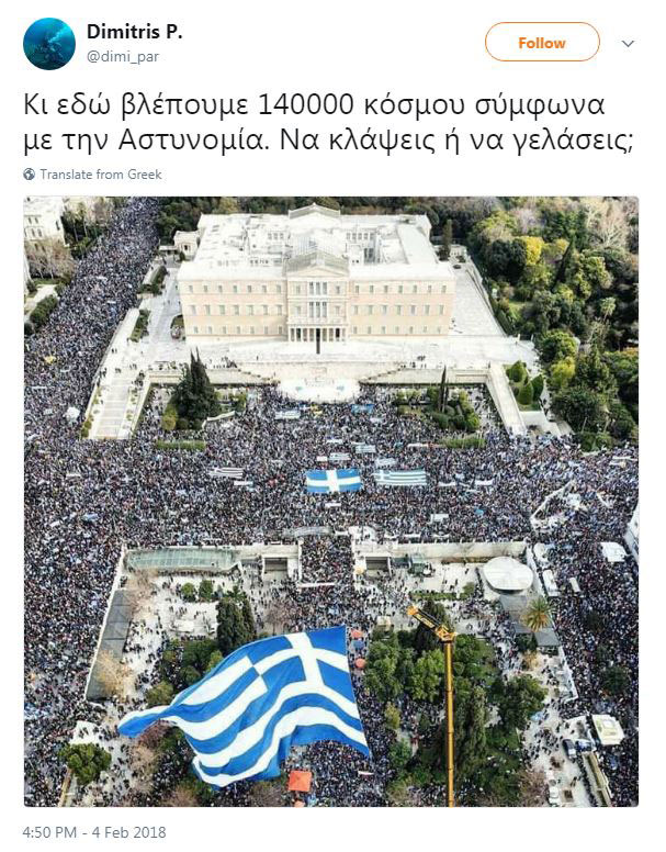 Πάρτυ στο twitter μετά την ανακοίνωση της ΕΛΑΣ, για τον αριθμό συμμετεχόντων στο συλλαλητήριο που έκανε λόγο για 140.000 διαδηλωτές της πλατείας Συντάγματος.