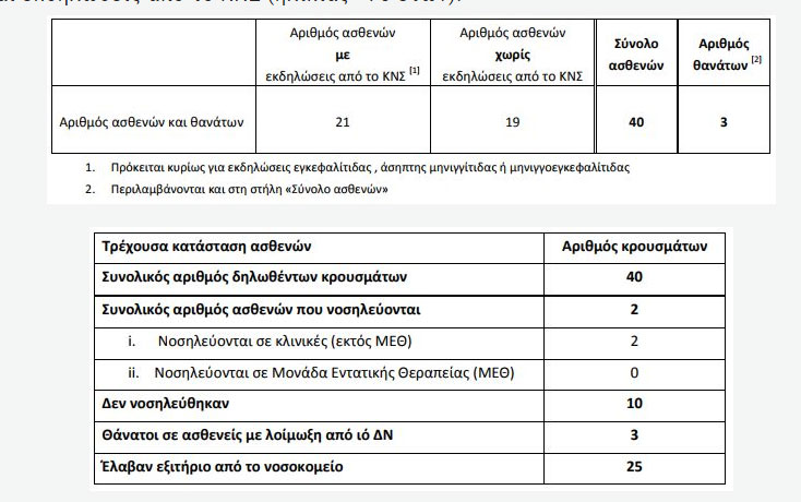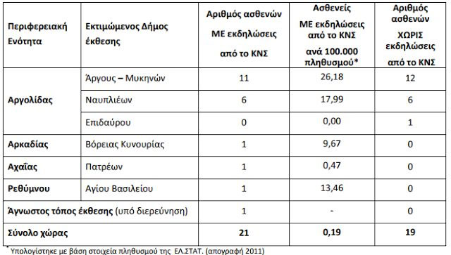 Τα κρούσματα αυτά εντοπίστηκαν στην Αχαΐα, στο Ρέθυμνο της Κρήτης και ένα ακόμα κρούσμα που δεν έχει τακτοποιηθεί ο τόπος έκθεσης και είναι υπό διερεύνηση.