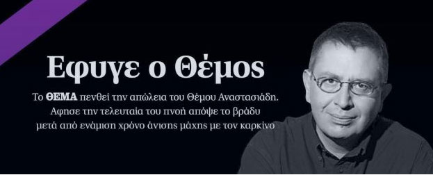 Θλίψη στον δημοσιογραφικό κόσμο καθώς πέθανε ο δημοσιογράφος και εκδότης και εκδότης της εφημερίδας «Πρώτο Θέμα», Θέμος Αναστασιάδης σε ηλικία 61 ετών.