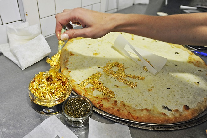 Η πίτσα, δημιουργήθηκε στο εστιατόριο Champion Pizza, στο Μανχάταν και η τιμή της κυμαίνεται από 5.000 έως 10.000 δολάρια, ανάλογα με την ποσότητα του πολύτιμου υλικού που επιθυμεί κάποιος.