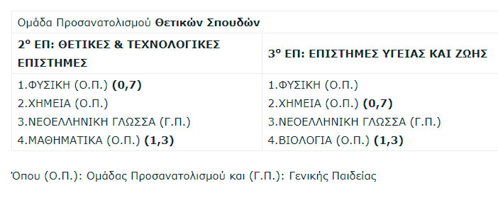 Ειδικότερα οι εναλλακτικοί συνδυασμοί πανελλαδικώς εξεταζομένων μαθημάτων της Ομάδας Προσανατολισμού Θετικών Σπουδών ανά Επιστημονικό Πεδίο και οι συντελεστές βαρύτητας των δύο μαθημάτων παρουσιάζονται στον παρακάτω πίνακα: