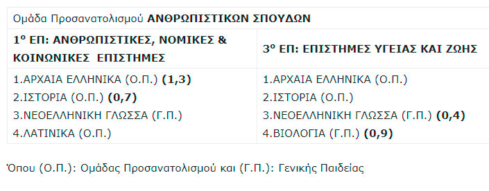 Ειδικότερα, οι εναλλακτικοί συνδυασμοί πανελλαδικώς εξεταζομένων μαθημάτων της Ομάδας Προσανατολισμού Ανθρωπιστικών Σπουδών ανά Επιστημονικό Πεδίο και οι συντελεστές βαρύτητας των δύο μαθημάτων παρουσιάζονται στον παρακάτω πίνακα: