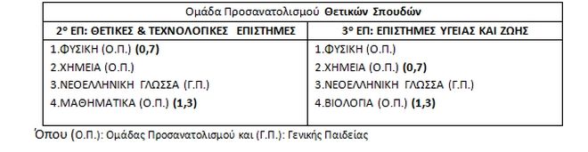 Ειδικότερα οι εναλλακτικοί συνδυασμοί πανελλαδικώς εξεταζομένων μαθημάτων της Ομάδας Προσανατολισμού Θετικών Σπουδών ανά Επιστημονικό Πεδίο και οι συντελεστές βαρύτητας των δύο μαθημάτων παρουσιάζονται στον παρακάτω πίνακα: