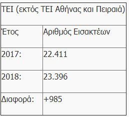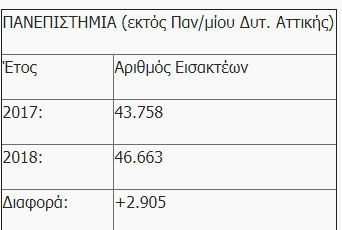Επομένως, συνολικά για το 2018 οι θέσεις εισακτέων για την Τριτοβάθμια Εκπαίδευση είναι 74.692 ενώ για το 2017 ήταν 70.726. Κατά συνέπεια η αύξηση ανέρχεται σε 3.966 θέσεις.