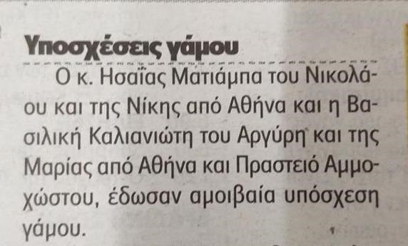 Η αγγελία του γάμου δημοσιεύτηκε σήμερα, Τρίτη, στην κυπριακή εφημερίδα Φιλελεύθερος και αναφέρει: «ο κ. Ησαΐας Ματιάμπα του Νικολάου και της Νίκης από Αθήνα και η Βασιλική Καλανιώτη του Αργύρη και της Μαρίας από Αθήνα και προάστιο Αμμοχώστου έδωσαν αμοιβαία υπόσχεση γάμου».