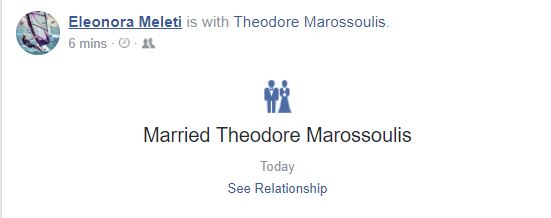 Η παρουσιάστρια άλλαξε την προσωπική της κατάσταση στο Facebook από «σε σχέση» με τον Θοδωρή Μαροσούλη σε «παντρεμένη», ενώ, λίγη ώρα αργότερα και αφού είχαν αρχίσει τα πρώτα διαδικτυακά δημοσιεύματα, το διέγραψε.