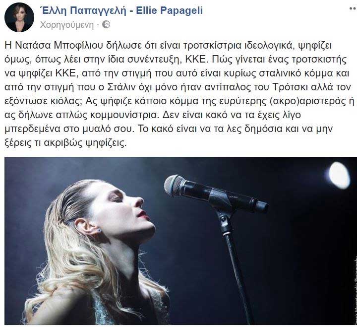 “Η Νατάσσα Μποφίλιου δήλωσε ότι είναι τροτσκίστρια ιδεολογικά, ψηφίζει όμως, όπως λέει στην ίδια συνέντευξη, ΚΚΕ. Πώς γίνεται ένας τροτσκιστής να ψηφίζει ΚΚΕ, από την στιγμή που αυτό είναι κυρίως σταλινικό κόμμα και από την στιγμή που ο Στάλιν όχι μόνο ήταν αντίπαλος του Τρότσκι αλλά τον εξόντωσε κιόλας; Ας ψήφιζε κάποιο κόμμα της ευρύτερης (ακρο)αριστεράς ή ας δήλωνε απλώς κομμουνίστρια. Δεν είναι κακό να τα έχεις λίγο μπερδεμένα στο μυαλό σου. Το κακό είναι να τα λες δημόσια και να μην ξέρεις τι ακριβώς ψηφίζεις”.