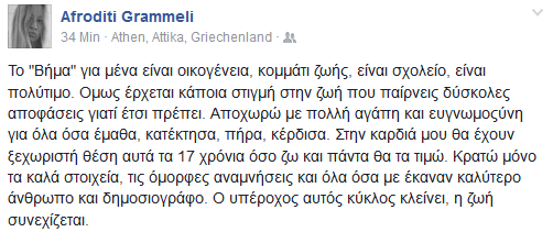 Πρόκειται για μια παραίτηση, που σίγουρα θα κάνει αίσθηση. Η γνωστή τηλεκριτικός είναι ιδιαίτερα γνωστή για την αιχμηρή της πένα και η αποχώρηση της από την εφημερίδα είναι ένα «σοκ» για τους ανθρώπους του χώρου. H Αφροδίτη Γραμμέλη μετά από 17 χρόνια στο «Βήμα», αποφάσισε να αποχωρήσει και το ανακοινώσει μέσα από τον προσωπικό της λογαριασμό στο Facebook.