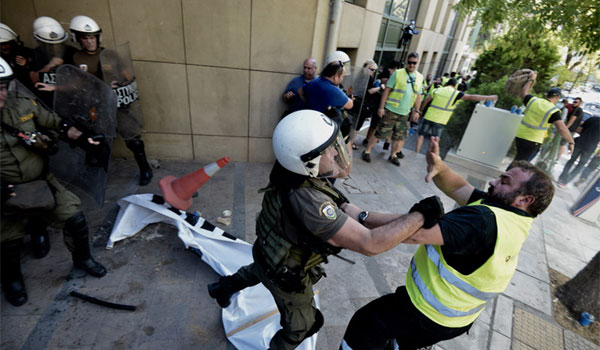 Την ίδια ώρα έξω από το υπουργείο ανήρτησαν πανό, ενώ προκλήθηκε ένταση και συγκρούσεις μεταξύ διαμαρτυρόμενων και αστυνομίας.