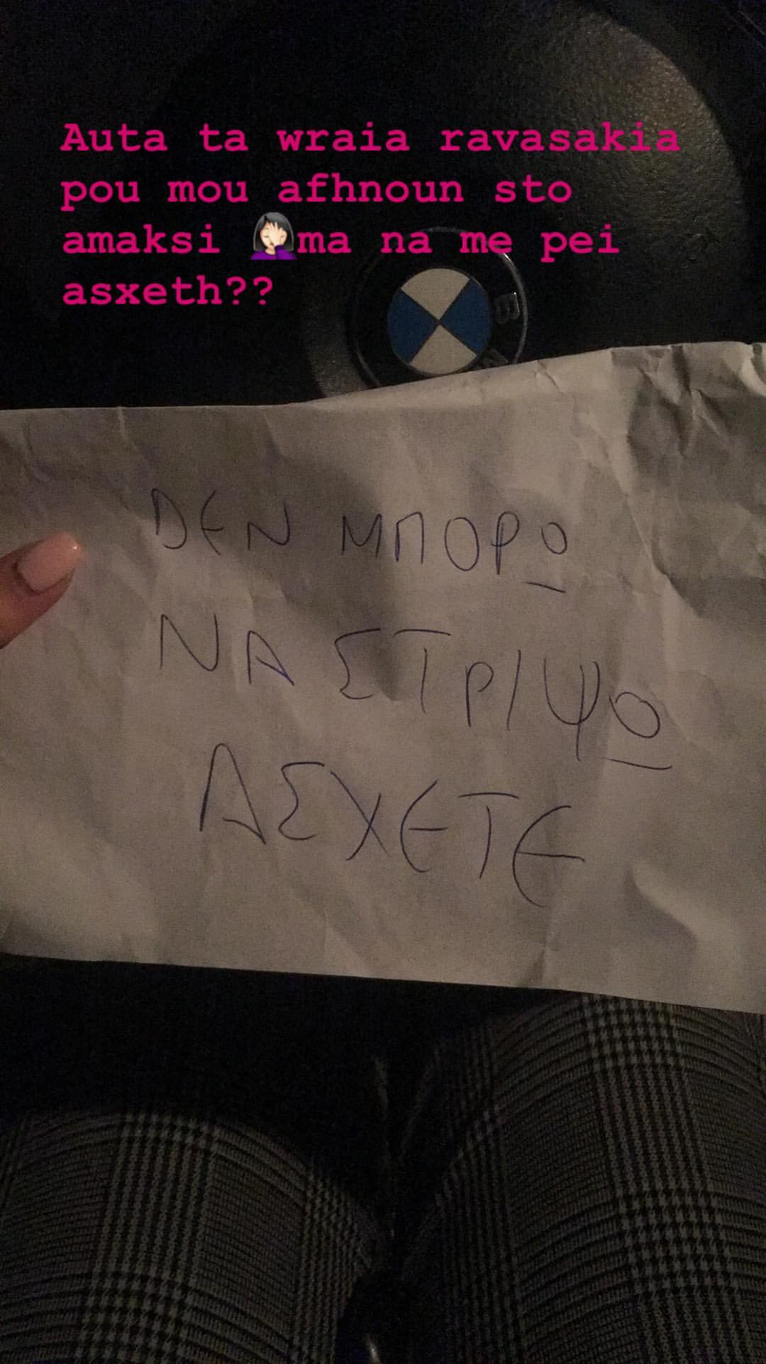 Το όμορφο μοντέλο που εδώ και καιρό αποφάσισαν από κοινού με τον Γιώργο Μανίκα να πάρουν ξεχωριστούς δρόμους βρήκε το μήνυμα αυτό και φρόντισε να σχολιάσει: «Αυτά τα ωραία ραβασάκια που μου αφήνουν στο αμάξι…μα να με πει άσχετη»;