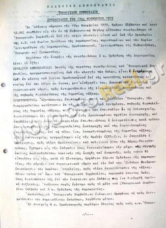 Τα πρακτικά της απόφασης του υπουργικού συμβουλίου της Χούντας στις 17 Νοεμβρίου του 1973, την ημέρα εισβολής του τανκς στο Πολυτεχνείο, φέρνει στο φως της δημοσιότητας το real.gr.