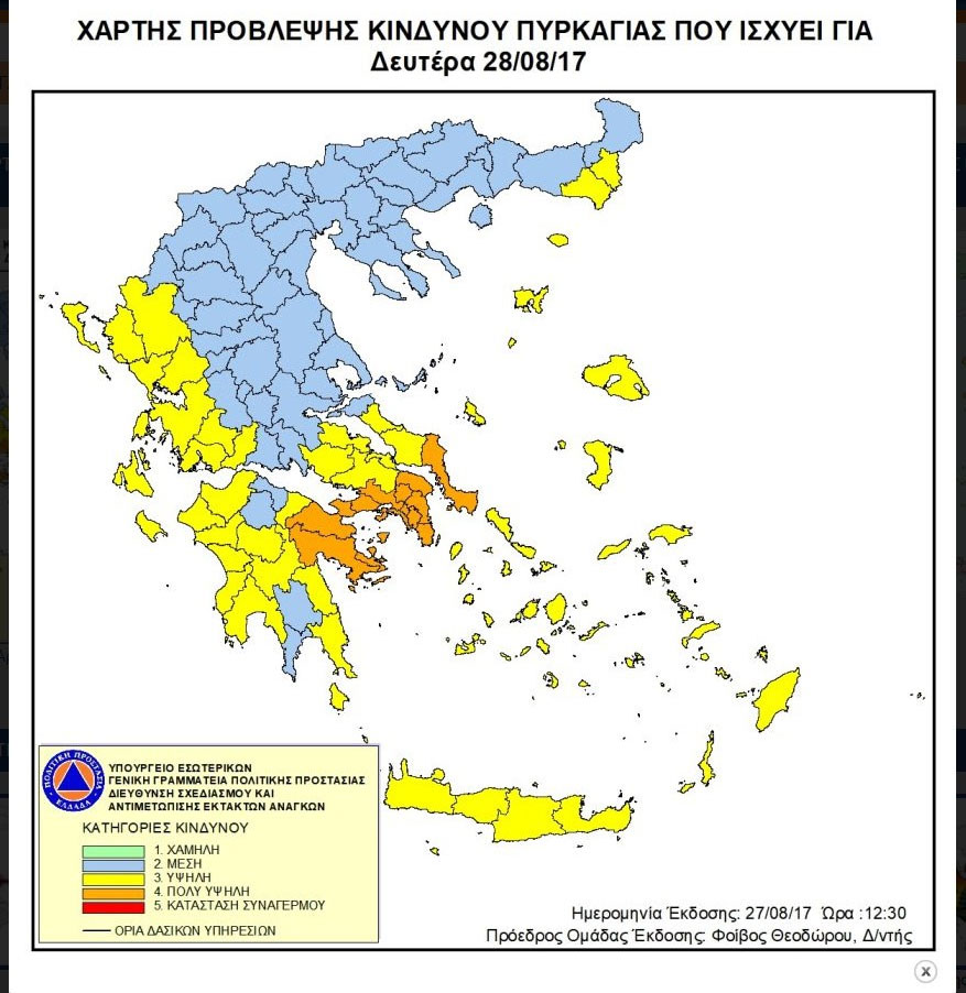 Ειδικότερα, σύμφωνα με τον Χάρτη Πρόβλεψης Κινδύνου Πυρκαγιάς που εκδίδει η Γενική Γραμματεία Πολιτικής Προστασίας του Υπουργείου Εσωτερικών (www.civilprotection.gr), για σήμερα προβλέπεται πολύ υψηλός κίνδυνος πυρκαγιάς (κατηγορία κινδύνου 4) για τις εξής περιοχές:
