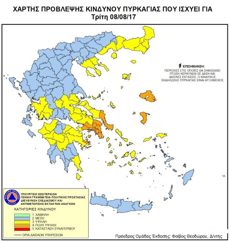 Αυξημένος είναι και πάλι σήμερα ο κίνδυνος πυρκαγιάς σε τρεις περιοχές της χώρας. Πολύ υψηλός κίνδυνος πυρκαγιάς (κατηγορία κινδύνου 4) προβλέπεται, σύμφωνα με τον χάρτη πρόβλεψης κινδύνου πυρκαγιάς που εκδίδει η Γενική Γραμματεία Πολιτικής Προστασίας, για τις εξής περιοχές: