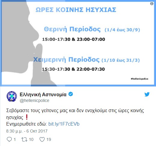 Η ελληνική αστυνομία ενημερώνει τους πολίτες για την αλλαγή στις ώρες κοινής ησυχίας μέσω του λογαριασμού της στο Twitter.