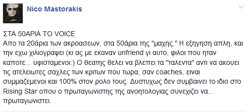 Μέσα από το προσωπικό του λογαριασμό στο facebook, αναφέρθηκε στην μεγάλη επιτυχία που γνωρίζει το «The Voice» στο Σκάι, ενώ τόνισε πως «Rising Star» συνεχίζει να πρωταγωνιστεί η ανοητολογία.