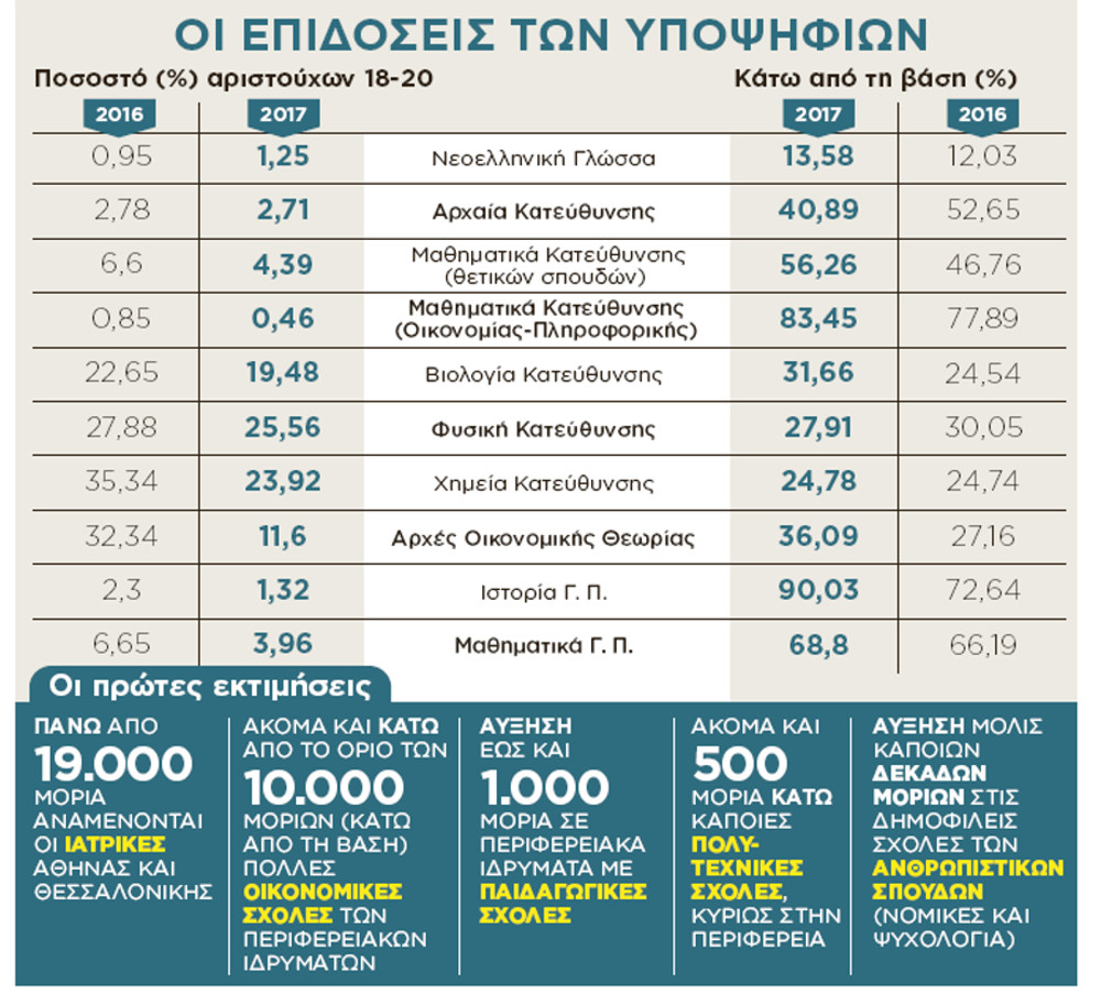 Παρά τη σφοδρότατη κριτική που δέχτηκε η κεντρική επιτροπή εξετάσεων για τα ζητούμενα στα Μαθηματικά Κατεύθυνσης, υπήρξαν υποψήφιοι που απέδειξαν ότι μπόρεσαν να ανταποκριθούν ακόμα και στον τεράστιο όγκο των ερωτημάτων εντός μόλις τριών ωρών. Η μεγάλη έκπληξη όμως ήρθε στη Χημεία, στην οποία κατεγράφη 50% μείωση του ποσοστού των υποψηφίων που έγραψαν 19-20. Στη Φυσική τα στατιστικά δεν κατέγραψαν μεγάλες διαφορές σε σχέση με πέρσι. Κι αν οι δημοφιλείς σχολές από 17.500 μόρια και πάνω δεν δεχτούν μεγάλες απώλειες, δεν ισχύει το ίδιο για τις χαμηλόβαθμες, μιας και οι υποψήφιοι που έγραψαν κάτω από τη βάση στα Μαθηματικά εκτοξεύτηκαν στο 56,26%, με ένα επιπλέον 10% σε σχέση με πέρσι.