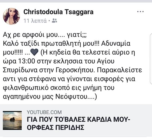 «Αχ ρε αδερφάκι μου… Γιατί; Καλό ταξίδι πρωταθλητή μου!!! Αδυναμία μου!», έγραψε η Χριστοδούλα στον λογαριασμό της στο Facebook και δημοσίευσε το τραγούδι Για Που Το ‘Βαλες Καρδιά Μου του Ορφέα Περίδη, ανακοινώνοντας πως η κηδεία θα γίνει αύριο, Τρίτη, στις 13:00, στον ιερό ναό του Αγίου Σπυρίδωνα στην Γεροσκήπου και ότι η οικογένεια ζητά, αντί στεφάνων, να γίνουν φιλανθρωπικές δωρεές στην μνήμη του 16χρονου.
