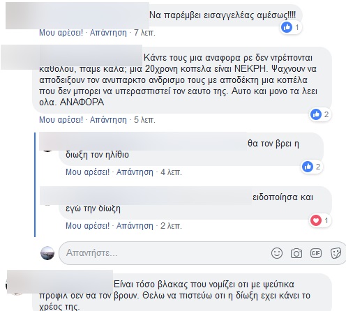 Ευχή όλων είναι η Δίωξη να μπορέσει να εντοπίσει ταχύτατα τους δράστες και να τους οδηγήσει ενώπιον της δικαιοσύνης. Ευτυχώς υπάρχουν και υγιείς αντιδράσεις. Κάτω από τα επίμαχα σχόλια που βλέπετε παρακάτω,  οι αντιδράσεις είναι πολλές. Εκείνοι που προσπαθούν να βρουν λέξεις για να περιγράψουν τα συναισθήματά τους, γι’ αυτά που μόλις διάβασαν.
