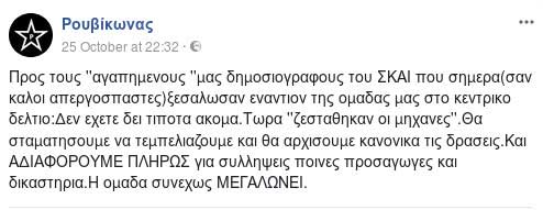 Ειδικότερα σε ανάρτησή του την Τετάρτη, 25 Οκτωβρίου (ημέρα απεργίας των δημοσιογράφων), ο Ρουβίκωνας γράφει απευθυνόμενος στους δημοσιογράφους του ΣΚΑΪ: «Προς τους ”αγαπημενους ”μας δημοσιογραφους του ΣΚΑΙ που σημερα (σαν καλοι απεργοσπαστες) ξεσαλωσαν εναντιον της ομαδας μας στο κεντρικο δελτιο: Δεν εχετε δει τιποτα ακομα.Τωρα ”ζεσταθηκαν οι μηχανες”. Θα σταματησουμε να τεμπελιαζουμε και θα αρχισουμε κανονικα τις δρασεις. Και ΑΔΙΑΦΟΡΟΥΜΕ ΠΛΗΡΩΣ για συλληψεις, ποινες, προσαγωγες και δικαστηρια. Η ομαδα συνεχως ΜΕΓΑΛΩΝΕΙ».