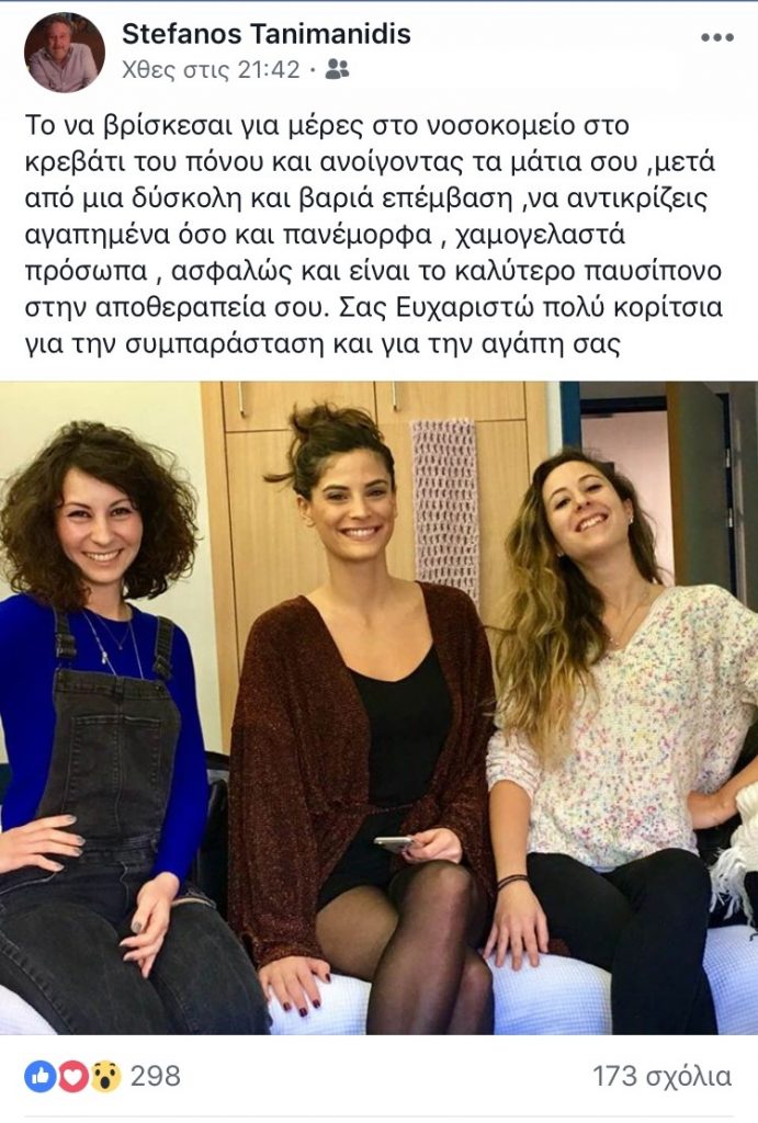 Όλα πήγαν καλά και σύμφωνα με τους γιατρούς ο πατέρας του παρουσιαστή θα χρειαστεί τουλάχιστον ένα τρίμηνο για να επανέλθει στην καθημερινότητά του. Παρ’ όλα αυτά, ο Στέφανος Τανιμανίδης δε χάνει την καλή του διάθεση και νιώθει ευγνώμων για τους ανθρώπους που είναι κοντά του. Εκτός από την οικογενιά του στο πλευρό του πατέρα του Σάκη βρίσκεται συνεχώς και η σύντροφός του Χριστίνα Μπόμπα. Την αγάπη και τη συγκίνησή του τα δήλωσε και δημόσια ο κύριος Τανιμανίδης με ένα post στο Facebook και μια φωτογραφία με τα… κορίτσια.