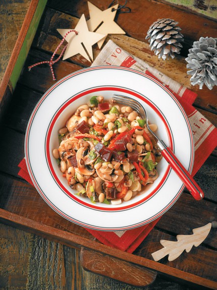 Ποιος είπε ότι τα θρεπτικά και τόσο νόστιμα όσπρια δεν ταιριάζουν σε ένα επίσημο, γιορτινό τραπέζι; Με τα κατάλληλα υλικά μετατρέπονται σε ένα υπέροχο πιάτο, όπως αυτή η σαλάτα με φασόλια από τη Φλώρινα και το Φενεό.