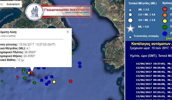 Σεισμός 4,1 Ρίχτερ εκδηλώθηκε πριν από λίγα λεπτά στη Λέσβο. Σύμφωνα με την αυτόματη, προκαταρκτική λύση του Γεωδυναμικού, η σεισμική δόνηση έγινε στις 13:37 και το εστιακό βάθος υπολογίστηκε στα 10 χλμ.
