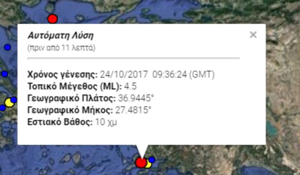 Σεισμική δόνηση μεγέθους 4,5 βαθμών της κλίμακας Ρίχτερ σημειώθηκε στις 12.36 το μεσημέρι στη θαλάσσια περιοχή  βορειοανατολικά της Κω, σύμφωνα με προκαταρκτική εκτίμηση του Γεωδυναμικού Ινστιτούτου.
