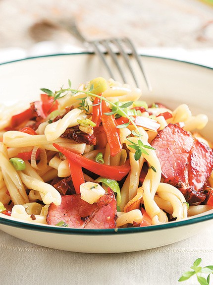 Ρίχνετε ξανά τα λαχανικά στο τηγάνι μαζί με το απάκι, να δέσουν οι γεύσεις, και σε χαμηλή φωτιά ανακατεύετε μέσα με τα μακαρόνια. Σερβίρετε αμέσως όσο είναι ζεστά.