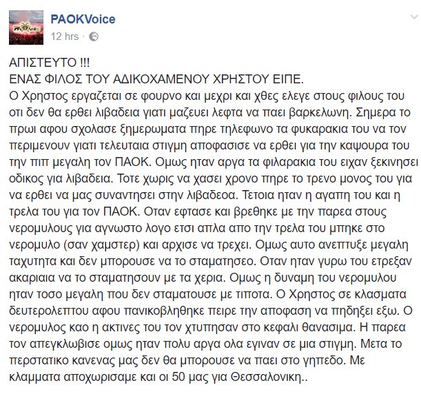«Ο Χρήστος εργάζεται σε φούρνο και μέχρι και χθες έλεγε στους φίλους του ότι δεν θα έρθει Λιβαδειά γιατί μαζεύει λεφτά να πάει Βαρκελώνη. Σήμερα το πρωί αφού σχόλασε ξημερώματα πήρε τηλέφωνο τα φιλαράκια του να τον περιμένουν γιατί τελευταία στιγμή αποφάσισε να έρθει για την καψούρα του την πιο μεγάλη τον ΠΑΟΚ. Όμως ήταν αργά τα φιλαράκια του είχαν ξεκινήσει οδικώς για Λιβαδειά. Τότε χωρίς να χάσει χρόνο πήρε το τρένο μόνος του για να έρθει να μας συναντήσει στην Λιβαδειά. Τέτοια ήταν η αγάπη του και η τρέλα του για τον ΠΑΟΚ. Όταν έφτασε και βρέθηκε με την παρέα στους νερόμυλους, για άγνωστο λόγο έτσι απλά από την τρέλα του μπήκε στο νερόμυλο (σαν χαμστερ) και άρχισε να τρέχει. Όμως αυτό ανέπτυξε μεγάλη ταχύτητα και δεν μπορούσε να το σταμάτησε. Όσοι ήταν γύρω του έτρεξαν ακαριαία να το σταματήσουν με τα χέρια. Όμως η δύναμη του νερόμυλου ήταν τόσο μεγάλη που δεν σταματούσε με τίποτα. Ο Χρήστος σε κλάσματα δευτερολέπτου αφού πανικοβλήθηκε πήρε την απόφαση να πηδήξει έξω. Ο νερόμυλος και οι ακτίνες του τον χτυπήσαν στο κεφάλι θανάσιμα. Η παρέα τον απεγκλώβισε όμως ήταν πολύ αργά. Όλα έγιναν σε μια στιγμή. Μετά το περιστατικό κανένας μας δεν μπορούσε να πάει στο γήπεδο. Με κλάματα αποχωρήσαμε και οι 50 μας για Θεσσαλονίκη…»