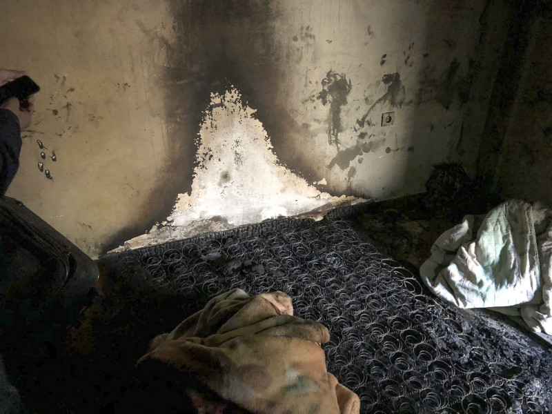 Όλο το διαμέρισμα του τρίτου ορόφου της οδού Αριστομένους είναι μαύρο από τους καπνούς. Τα στρώματα είναι καμένα, όπως επίσης το καρότσι του μωρού και το παρκοκρέβατό του.