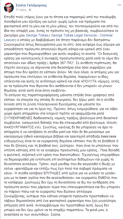 Ωστόσο, η Σούλα Γκλάμουρους επέστρεψε στα social media και, με ένα μακροσκελές κείμενο, εξηγεί ότι η σελίδα «κατέβηκε» με δική της πρωτοβουλία, για χιουμοριστικούς λόγους, καθώς δεν προέβη σε κάποιο παράπτωμα ώστε να παρέμβει η Δίωξη και «καρφώνει» την Σοφία για την συμπεριφορά της, κάνοντας λόγο για παραπληροφόρηση.