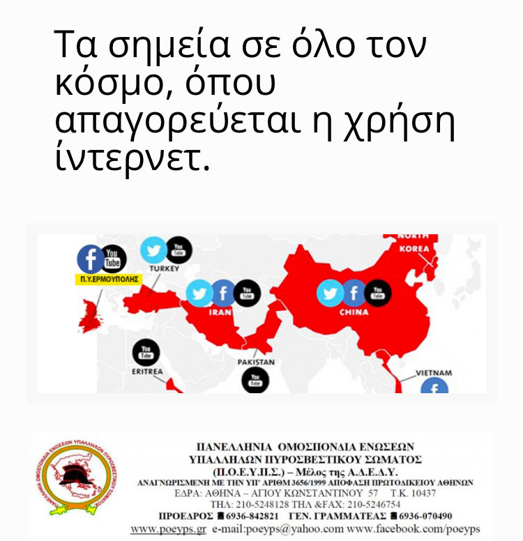 Ευρηματική αλλά και ιδιαίτερα καυστική ήταν η απάντηση της Π.Ο.Ε.Υ.Π.Σ που δημιούργησε έναν παγκόσμιο χάρτη με τα σημεία του πλανήτη όπου απαγορεύεται η πρόσβαση στο Ιντερνετ, όπως το Ιράν, η Τουρκία και η Βόρεια Κορέα συμπεριλαμβανόμενου και της Πυροσβεστικού Σώματος Νοτίου Αιγαίου που εδρεύει στο δήμο Ερμούπουλης Σύρου. Μάλιστα ο χάρτης συνοδεύεται από ένα σχόλιο που αφορά στο υπηρεσιακό έγγραφο: «Το παρακάτω, μόνο ως κακόγουστο αστείο το εκλαμβάνουμε και βρισκόμαστε σε αναμονή για την άμεση απόσυρση του».