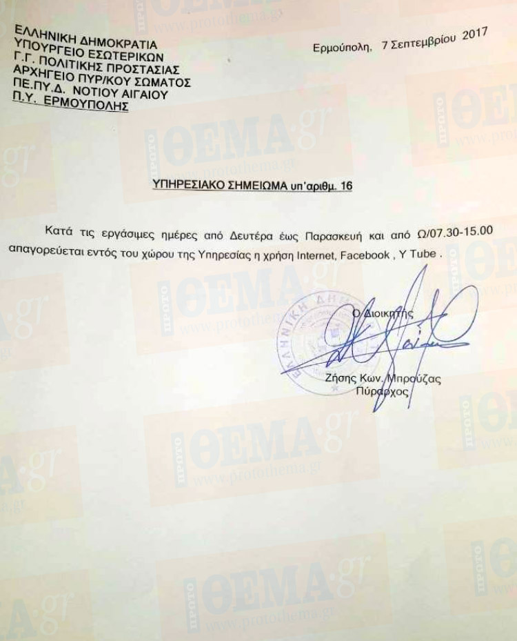 Το επίμαχο σημείωμα αναφέρει: «Κατά τις εργάσιμες ημέρες από Δευτέρα έως Παρασκευή και από 7.30- 15.00 απαγορεύεται εντός του χώρου της Υπηρεσίας η χρήση Internet, Facebook, ΥουTube».