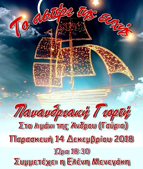 «Μ ένα καράβι φως υποδεχόμαστε σήμερα τα Χριστούγεννα στο λιμάνι της Άνδρου! Σε μια γιορτή χαράς , ελπίδας και προσφοράς ντυμένη με αγάπη , μουσικές , μυρωδιές και δημιουργίες από κάθε γωνία του νησιού , το Γαύριο φωτίζει το καράβι του και ανοίγει τριήμερο εορταστικών εκδηλώσεων σήμερα στις 6:30 μ.μ»