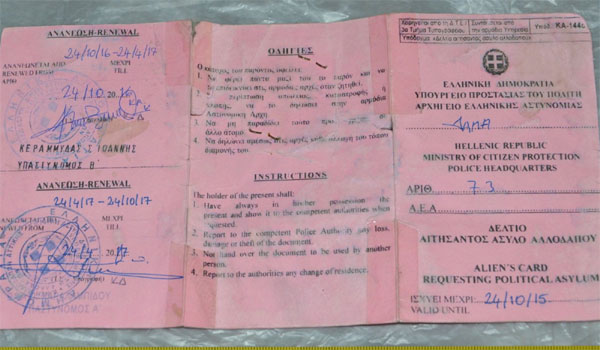 δελτίο αιτήσαντος ασύλου αλλοδαπού, με αριθμό 143103, ΑΕΑ 95/000/71(4 ή 6)22 εκδοθέν από ΔΑΠΑ, με στοιχεία κατόχου (επ.) GUZEL (ον.) ALI του MUSTAFA και της AYSE, γεννηθείς 07-01-1977 στην Τουρκία, κατοίκου επί της οδού Τζαβέλα αρ. 17 Αθήνα
