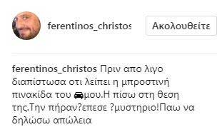 Ο λόγος, για τον Χρήστο Φερεντίνο, ο οποίος ανέβασε μία φωτογραφία στον προσωπικό του λογαριασμό στο Instagram, γράφοντας χαρακτηριστικά και με χιουμοριστικό ύφος: «Πριν από λίγο διαπίστωσα ότι λείπει η μπροστινή πινακίδα του αυτοκινήτου μου. Η πίσω στη θέση της. Την πήραν; Έπεσε; μυστήριο! Πάω να δηλώσω απώλεια».