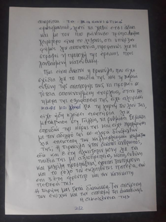 “Η απώλεια της αγαπημένης μας Ειρήνης, θύμα εγκληματικής ενέργειας, μας έχει συγκλονίσει όλους. Μας διακατέχει απέραντη θλίψη αλλά και θυμός, για τον άδικο χαμό της και ζητούμε εναγωνίως να εξιχνιασθεί το ταχύτερο δυνατόν το έγκλημα και να αποδοθεί δικαιοσύνη για την αποτρόπαια πράξη” αναφέρει μεταξύ άλλων η οικογένεια της άτυχης 44χρονης στην επιστολή και καταλήγει: