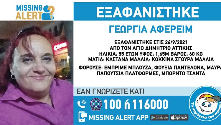 Όπως αναφέρεται στην ανακοίνωση, στις 26/09/2021 εξαφανίστηκε από την περιοχή του Αγίου Δημητρίου η Αφερείμ Γεωργία, 55 ετών. Το Χαμόγελο του Παιδιού ενημερώθηκε για την εξαφάνιση της Αφερείμ Γεωργίας