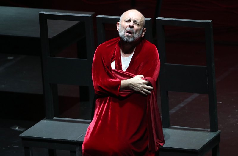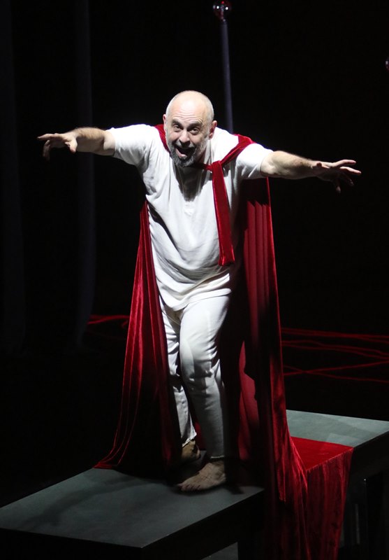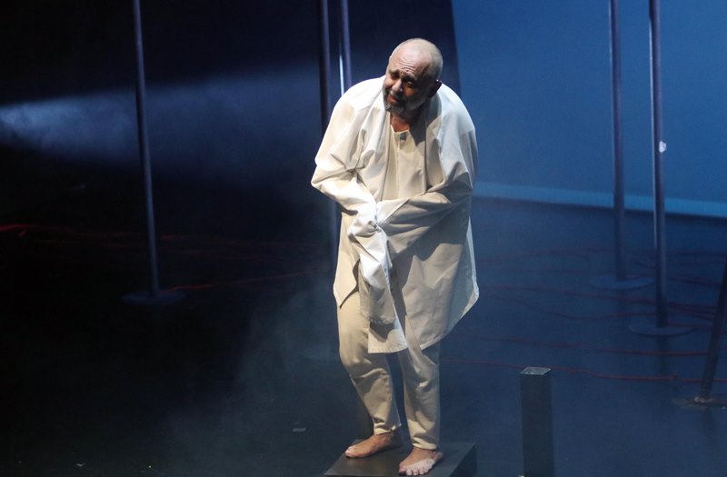 Ο 59χρονος πρώην διευθυντής του Εθνικού και του Κρατικού, χρησιμοποιώντας με μαεστρία τα αστείρευτα εκφραστικά του μέσα έκανε την αχανή σκηνή του θεάτρου να μοιάζει με ένα μικρό δωμάτιο. Δωμάτιο στο οποίο επί μιάμιση ώρα σφυροκοπούσε με ατάκες και σιωπές, συνεχείς εναλλαγές ρυθμού ένα σύνθετο κείμενο, που περιγράφει τη σταδιακή κατρακύλα του μυαλού στις πιο σκοτεινές του ατραπούς.