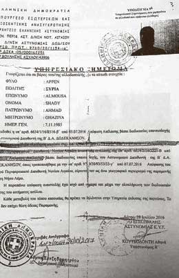 Το έγγραφο με το οποίο οι Αρχές τον αναγνώρισαν ως πρόσφυγα και δεν φυλακίστηκε ως παράνομος μετανάστης (Ιούλιος 2016).