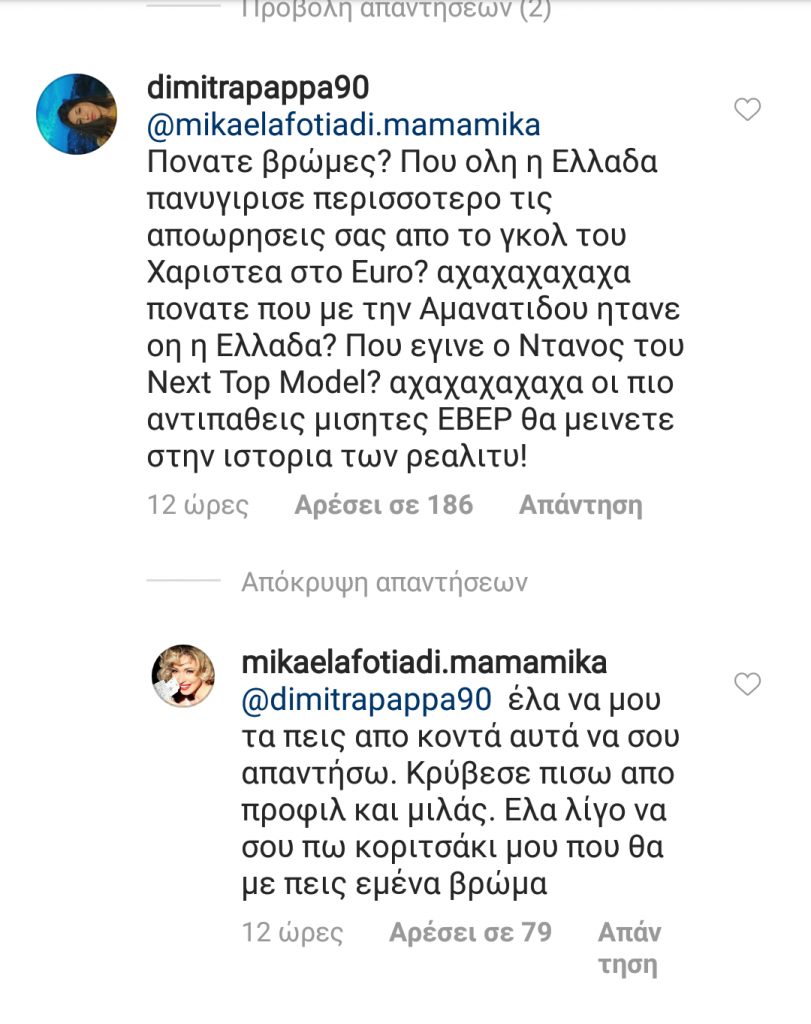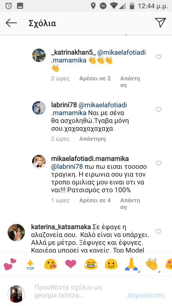 H απάντηση της Μικαέλα ξεσήκωσε μια σειρά αρνητικών σχολίων που το μοντέλο δεν άφησε ασχολίαστα. Ένας από τους haters την είπε βρ@μ@ ενώ κάποιος άλλος χαρακτήρισε την «τριάδα της φωτιάς» μισητή. «Έλα να μου τα πεις αυτά από κοντά να σου απαντήσω. Κρύβεσαι πίσω από το προφίλ και μιλάς. Έλα λίγο να σου πω κοριτσάκι μου που θα με πεις εμένα βρ@μ@», έγραψε η Μικαέλα ενώ η κόντρα συνεχίστηκε και πιο κάτω.