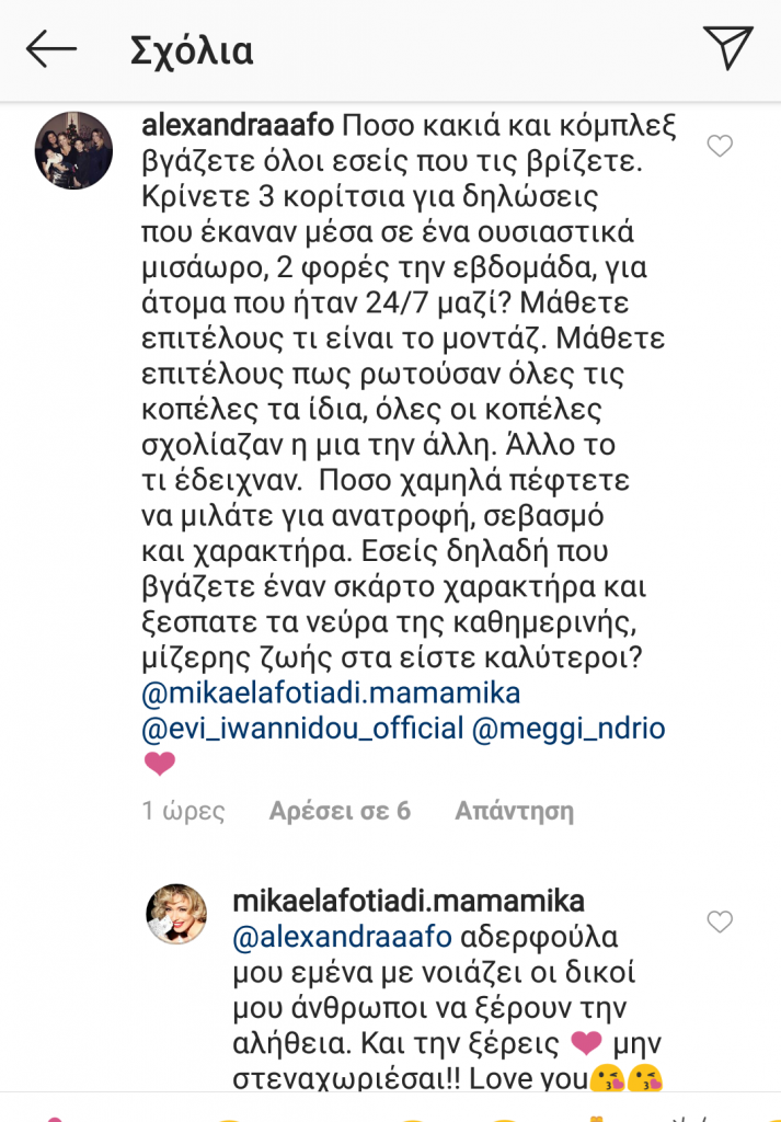 Φυσικά υπήρχαν και πολλά comments που στήριζαν την 23χρονη. Ανάμεσα σε αυτά και το σχόλιο της αδελφής της Μικαέλας η οποία ήθελε να δηλώσει την αντίθεσή της στον «πόλεμο» που έχει δεχτεί η τριάδα φωτιά και να δικαιολογήσει τη συμπεριφορά των κοριτσιών. Η Μικαέλα θέλησε επίσης να απαντήσει στην αδελφή της και να της εξηγήσει πως πρόκειται για ένα παιχνίδι. «Αδελφούλα μου εμένα με νοιάζει οι δικοί μου άνθρωποι να ξέρουν την αλήθεια. Και την ξέρεις, μην στεναχωριέσαι! Love you», έγραψε.