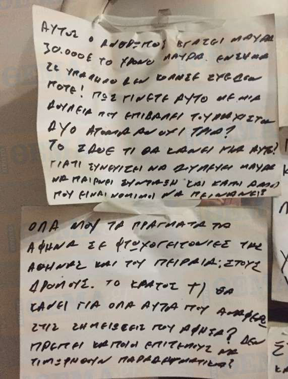 Συγκεκριμένα το σημείωμα αναφέρει: «Στο Word στο κινητό μου και στο τάμπλετ μου θα βρείτε το σημείωμα που άφησα. Να αναλάβει την υπόθεση η κα Νικολούλη στον Alpha γιατί είμαι σίγουρος πως η πολιτεία και η ΕΛΑΣ δεν θα κάνει ούτε τα μισά από αυτά που αναφέρω. Αν υπάρχει κράτος τώρα θα φανεί. Αλλιώς και αυτή η κυβέρνηση θα φανεί…».