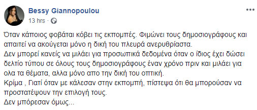 Η ίδια η θεατρική παραγωγός αντέδρασε μέσα από τον προσωπικό της λογαριασμό στο Facebook γράφοντας για το αιφνίδιο κόψιμό της τα εξής: «Όταν κάποιος φοβάται κόβει τις εκπομπές. Φιμώνει τους δημοσιογράφους και απαιτεί να ακούγεται μόνο η δική του πλευρά ανερυθρίαστα.