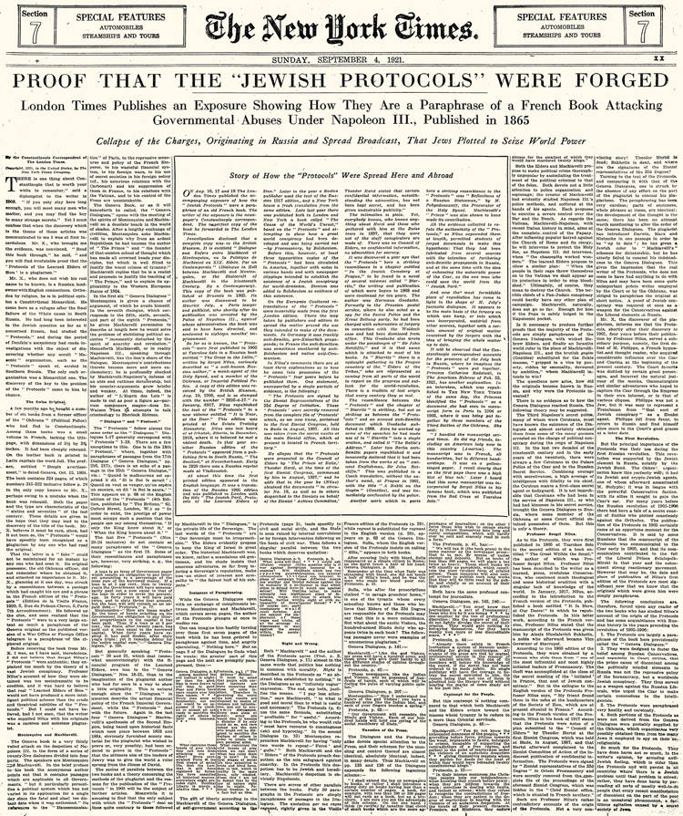 Ήδη από πολύ νωρίς στην ιστορία τους, αποδείχθηκε πως τα «Πρωτόκολλα» ήταν προϊόν πλαστογραφίας. Και λογοκλοπής! Τον Μάιο του 1920, οι «Times of London» έγραψαν υπέρ τους, θεωρώντας πως είναι γνήσια εξαιτίας της προφητικής τους φύσης. Έναν χρόνο μετά ωστόσο απέσυραν την υποστήριξή τους στην μπροσούρα. Ο ανταποκριτής της εφημερίδας στην Κωνσταντινούπολη, Philip Graves, ανακάλυψε πως το κείμενο ήταν κατασκευασμένο.