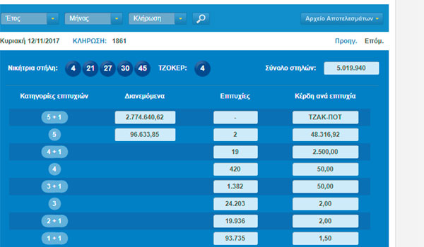 H κλήρωση Τζόκερ ΟΠΑΠ, σήμερα Κυριακή 12-11-2017 (αριθμός κλήρωσης 1861), μοιράζει περισσότερα από 2.700.000 ευρώ στους νικητές της πρώτης κατηγορίας.