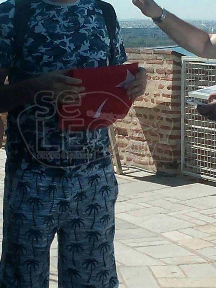 «Αφού τελείωσε η βόλτα και οι φωτογραφίες στο «μπαλκόνι» του Λευκού Πύργου πήραμε την κάθοδο… Κατεβαίνοντας τις σκάλες, στον 4ο όροφο είδαμε μια ομάδα 6-7 ατόμων να ανεβαίνουν προς τον 5ο όροφο ενώ ένας από αυτούς έβγαλε από την τσέπη του την Τουρκική σημαία. Η φίλη μου κατάλαβε αμέσως τι θα συμβεί και απευθυνόμενη σε εμένα μου λέει: «Να δεις που θα πάνε επάνω να ανοίξουν τη σημαία και να βγουν φωτογραφίες». Δίχως να χάσω δευτερόλεπτο της λέω: «Γυρνάμε πίσω» περιγράφει.