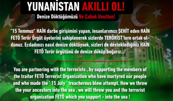 Το μήνυμα που έστειλαν οι χάκερς είναι πανομοιότυπο με εκείνο που είχαν στείλει και στα προηγούμενα χτυπήματα. Οι Τούρκοι χάκερς αναφέρονται και πάλι στους 8 τούρκους αξιωματικούς που είναι στην Ελλάδα και έχουν ζητήσει άσυλο.