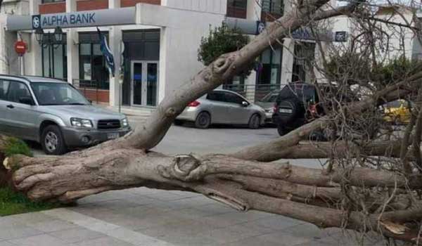 Το ίδιο σκηνικό υπήρξε με δέντρο που ξερίζωσε ο αέρας, και στην οδό Τζαβέλλα, κοντά στο 3ο Δημοτικό σχολείο Φαρσάλων.