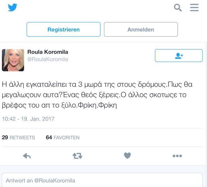 Με αφορμή την εγκατάλειψη των τριών μικρών παιδιών στην Πάτρα που έχει συγκλονίσει το Πανελλήνιο, η Ρούλα Κορομηλά, γνωστή για την ευαισθησία της στα θέματα παιδιών, εξέφρασε τη θλίψη της για την αποτρόπαιη αυτή πράξη, μέσα από τον λογαριασμό της στο twitter, γράφοντας: